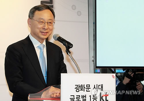 | △ 황창규 KT 회장, "국민이익에 기여하는 기업 될 것" (서울=연합뉴스) 26일 서울 KT광화문빌딩 이스트(East)에서 황창규 KT 회장이 신사옥 입주를 축하하며 "통신 130년의 역사를 이어받은 KT가 올해부터는 국가경제와 국민 이익에 기여하는 혁신적 국민기업이 될 것"이라고 선언하고 있다. 2015.1.26 << KT 제공 >> photo@yna.co.kr |