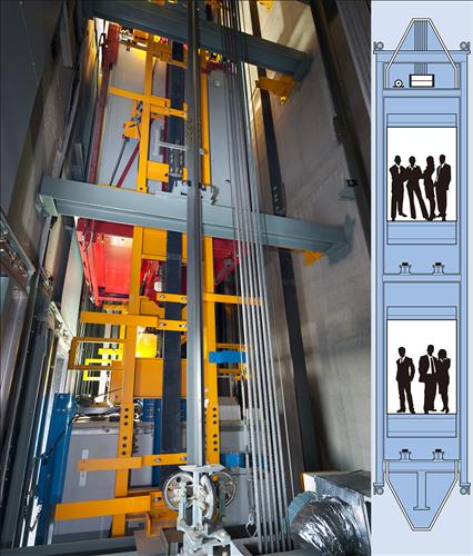 더블데크 엘리베이터는 한 개의 승강로에 2대의 엘리베이터를 상하로 연결해 동시에 운행하는 복층 엘리베이터다.