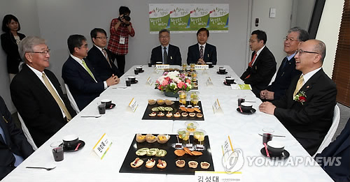 | △ 문형표 장관, 보건의 날 수상자들과 환담 (세종=연합뉴스) 배재만 기자 = 문형표 보건복지부 장관이 보건의 날인 7일 오후 정부세종청사 대강당에서 열린 제43회 보건의 날 기념식에서 국민훈장 무궁화장을 수상한 신영수 세계보건기구(WHO) 서태평양지역사무처 사무처장(왼쪽) 등 수상자들과 함께 얘기를 나누고 있다. |