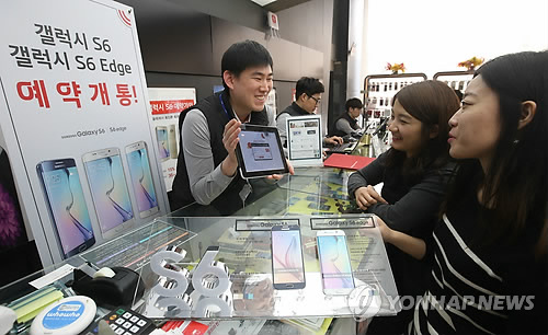 | △ 갤럭시S6 예약개통 개시 (서울=연합뉴스) 임헌정 기자 = 삼성전자의 스마트폰 갤럭시S6 예약개통이 개시된 1일 오후 서울 종로구 광화문 KT올레스퀘어에서 고객들이 휴대전화 구매상담을 하고 있다. 2015.4.1 kane@yna.co.kr |