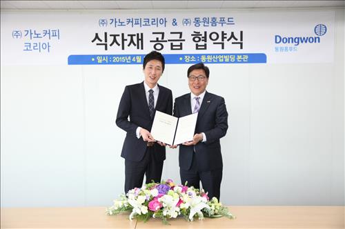 | △ 동원홈푸드(사진 우측 식자재사업부 김성용 상무)는 8일 가노커피코리아(사진 좌측 이현석 본부장)와 식자재 공급 업무협약을 맺었다. |