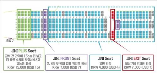 첫 번째 열과 비상구 좌석은 7천원(7달러)이 추가요금으로 책정됐다.
