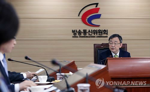 | △ 방통위 전체회의, 단말기 지원금 상한액 조정 (과천=연합뉴스) 홍해인 기자 = 최성준 방송통신위원장이 8일 오전 정부과천청사 방송통신위원회 회의실에서 열린 전체회의에 참석해 회의를 주재하고 있다. |