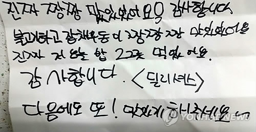 | △ 배달 도시락에 남긴 감사 편지 (전주=연합뉴스) 홍인철 기자 = 엄마가 새벽 일찍 일을 나가는 바람에 제대로 아침밥을 챙겨 먹지 못한 승준(13·가명)이는 27일 전북 전주시가 제공하는 도시락을 먹고 나서 짤막한 감사의 글을 남겼다. 2014.10.27 <<지방기사 참조>>. DB. ichong@yna.co.kr |