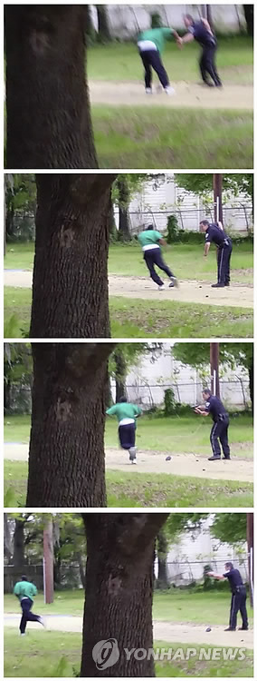 | △ '노스찰스턴' 흑인 총격피살 과정 (AP=연합뉴스) 미국 사우스캐롤라이나 주(州) 노스찰스턴의 백인 경관 마이클 토머스 슬레이저(33)가 7일(현지시간) 비무장 흑인 월터 라머 스콧(50)을 총으로 쏴 숨지게 해 살인 혐의로 기소됐다. 슬레이저는 지난 4일 오토바이를 타고 가던 스콧을 교통위반으로 단속하던 중 달아나던 그에게 총격을 가한 것으로 조사됐다. 스콧의 변호인이 제공한 동영상에서 캡처한 것으로, 슐레이저(왼쪽)가 스콧에게 총격을 가하기 까지 과정을 보여주고 있다. |
