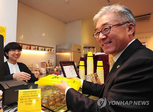 | △ 도서정가제가 시행된 21일 오후 김종덕 문화체육관광부 장관이 서울 서교동의 한 서점을 방문, 2014년 문화체육관광부가 선정한 세종도서를 구입하고 있다. 2014.11.21 << 문화체육관광부 제공 >> |
