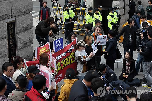 (서울=연합뉴스) 권영전 기자 = 헌법재판소의 '성매매알선 등 행위의 처벌에 관한 법률(성매매 특별법)' 공개변론이 열린 9일 한터전국연합·한터여종사자연맹 등 성매매 종사자들이 헌재에 이 법 폐지를 위한 탄원서를 제출했다.
