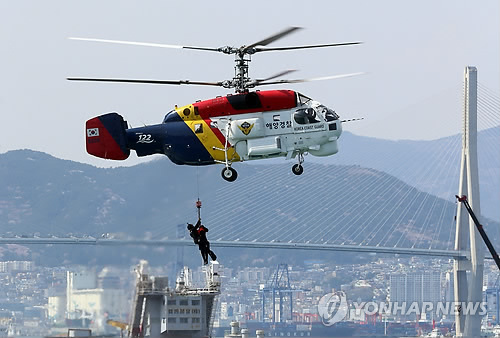 | △ 해상 사고 골든타임을 사수하라 (부산=연합뉴스) 김선호 기자 = 세월호 사고 이후 해양사고 골든타임 사수를 위해 신설된 중앙해양특수구조단 대원들이 9일 오후 부산시 영도구 부산해양경비안전서 전용부두 해상에서 헬기와 함정을 이용한 구조훈련을 벌이고 있다. 2015.4.9 wink@yna.co.kr |