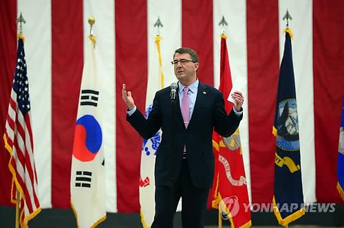 | △ 취임 후 첫 방한한 애쉬턴 카터 미 국방장관이 9일 오후 오산 공군기지에 도착한 뒤 주한 미군 장병들을 만나 연설하고 있다. |