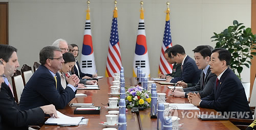 | △ 한-미 국방장관 회담 개최 (서울=연합뉴스) 홍해인 기자 = 취임 후 첫 방한한 애쉬턴 카터 미국 국방장관이 10일 오후 서울 용산 국방부에서 한민구 국방장관과 회담하고 있다. 2015.04.10 hihong@yna.co.kr |