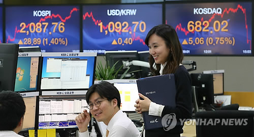 | △ 코스피, 2,090선 육박 (서울=연합뉴스) 서명곤 기자 = 코스피지수가 전날보다 28.89포인트(1.40%) 오른 2,087.76으로 거래를 마감한 10일 오후 서울 중구 명동 외환은행 본점 딜링룸에서 딜러들이 활짝 웃으며 대화를 나누고 있다. |