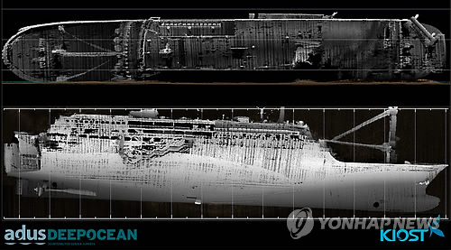 | △ 해양수산부, 세월호 인양 기술적 가능 (서울=연합뉴스) 해양수산부가 10일 공개한 세월호 선체 외부탐사 재현 결과 3D 이미지. 해양수산부는 세월호 인양이 기술적으로 가능하며, 누워 있는 상태 그대로 통째로 인양하는 방법이 유력하다는 결론을 10일 발표했다. 2015.4.10 << 해양수산부 제공 >> photo@yna.co.kr |