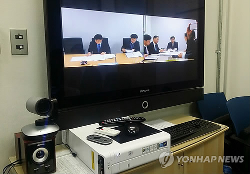 | △ 미래부, 국회-청사 화상연결 상임위 답변 준비 (서울=연합뉴스) 최양희 미래창조과학부 장관과 미래부 공무원들이 지난 10일 서울 여의도 국회에서 열린 미래창조과학방송통신위원회 답변 준비를 위해 정부과천청사 사무실과 국회 구내우체국 내 마련된 사무실을 연결하는 화상회의를 하고 있다. (미래창조과학부 제공) |