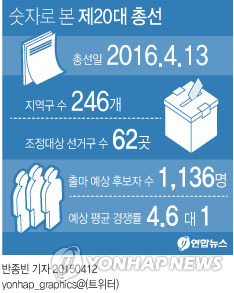 | △ <그래픽> 숫자로 본 제20대 총선 (서울=연합뉴스) 반종빈 기자 = 제20대 총선(2016년 4월13일)이 1년 앞으로 다가왔다. 연합뉴스가 전국 취재망을 동원해 17개 시도별 출마 예상자를 집계한 결과 246개 지역구에 출마 예상자로 거론되는 후보는 12일 현재 1천136명으로 평균 4.6대 1의 경쟁률을 보일 것으로 예상됐다. bjbin@yna.co.kr |
