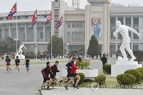 | △ 북한 마라톤대회에 외국인 650명 참가…작년의 3배 (평양 교도=연합뉴스) 북한이 올해 평양에서 주최한 국제마라톤대회에 예상보다 훨씬 많은 650명 규모의 외국인 선수들이 참가했다고 교도통신이 12일 보도했다. 북한 당국이 6개월여간의 에볼라 바이러스 차단을 위한 입국 제한조치를 지난달 대폭 해제한 덕분으로 풀이된다. 사진은 마라톤대회를 앞두고 11일 평양 김일성경기장 앞에서 연습하는 선수들. <<국제뉴스부 기사 참조>> 2015.4.12 chungwon@yna.co.kr |