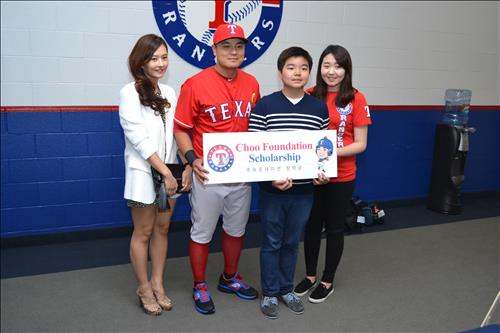 추신수는 11일(현지시간) 휴스턴 애스트로스와의 홈경기를 앞두고 장학생으로 선발된 알링턴 버넷 중학교 8학년인 한인 크리스 정 군에게 장학금 3천680달러(약 403만원)를 전달했다.