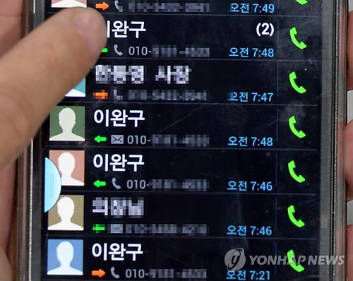 | △ 이완구 총리 전화기록 (서산=연합뉴스) 양영석 기자 = 새누리당 충남도당의 이기권 전 대변인이 12일 성완종 전 회장의 빈소가 있는 충남 서산의료원에서 기자 간담회를 열어 "이완구 총리가 성완종 전 경남기업 회장이 숨지기 전날 만났던 태안군의원들에게 전화를 걸어 대화 내용을 추궁했다"고 주장했다. 이에대해 총리실은 "사실여부를 확인했을 뿐"이라고 반박했다. 사진은 이 전 대변인이 이날 공개한 해당 기초의원의 휴대전화기 통화목록. |