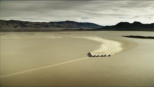 브이(V)자로 늘어선 제네시스 11대가 모랫바람을 일으키며 주행하면서 사막 위에 거대한 타이어 트랙 이미지를 만들어냈다.