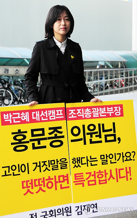 (의정부=연합뉴스) 김도윤 기자 = 김재연 전 통합진보당 의원은 13일 경기도 의정부시 회룡역 앞에서 '성완종 리스트'와 관련, "홍문종 의원은 특검을 통한 진상 규명에 응하라"며 1인 시위를 벌였다.