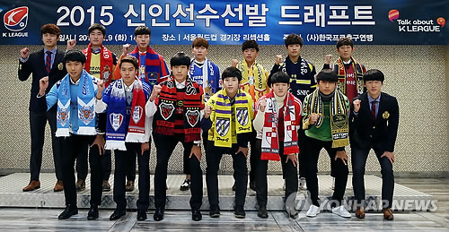 | △ 프로축구 2015 신인선수 드래프트 (서울=연합뉴스) 9일 오후 서울월드컵경기장에서 열린 K리그 2015 신인선수선발 드래프트에서 자유선발 선수들이 파이팅을 외치며 기념촬영을 하고 있다. 앞줄 왼쪽부터 대구 김진혁, 수원 한성규, 포항 오창현, 전남 정재혁, 부산 이규성, 전북 장윤호, 서울 이랜드 김창욱. 뒷줄 왼쪽부터 서울 이랜드 양기훈, 경남 최봉진, 수원FC 이인수, 울산 김승준, 광주 박선홍, 성남 성봉재, 대전 서명식. 2014.12.9 << 한국프로축구연맹 제공 >> photo@yna.co.kr |