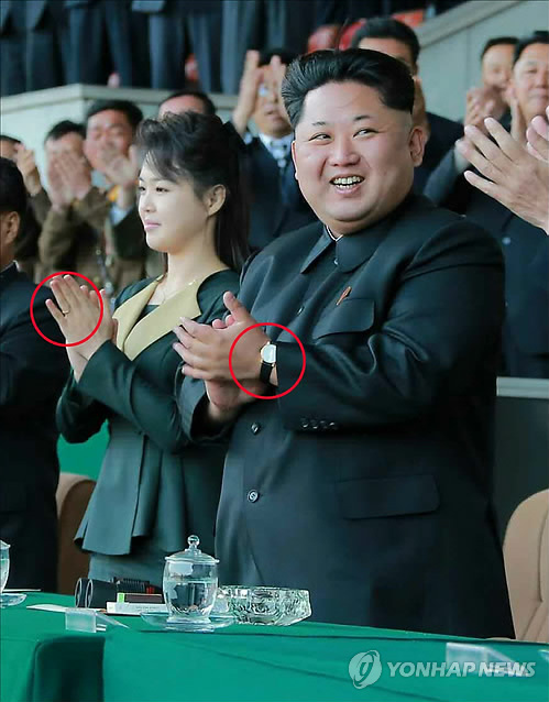 | △ 북한 김정은·리설주 부부의 액세서리 (서울=연합뉴스) 북한 김정은 국방위원회 제1위원장과 리설주 부부가 올해 처음으로 함께 공식활동에 나선 가운데 반지와 시계 등 액세서리가 눈에 띈다. 리설주의 왼손에는 김 제1위원장이 결혼하며 준 것으로 보이는 반지가 끼워져 있고, 김 제1위원장은 스위스 명품 브랜드 '파텍필립'으로 추정되는 손목시계를 차고 있다. 북한은 사회관습상 남녀모두 결혼반지를 잘 착용하지 않았으나 최근들어 여성들의 결혼반지 착용이 늘어나는 추세다. 아울러 김 제1위원장 앞 테이블 위에는 담배가 놓여있어 애연가인 그의 담배 사랑이 여전함을 드러냈다. 김 제1위원장 부부는 김일성 주석의 생일인 '태양절'을 맞아 13일 김일성경기장에서 진행된 만경대상체육경기대회 남자축구 경기를 관람했다고 노동신문은 14일 보도했다. |
