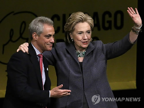 | △ 2016 대권 도전을 공식 선언한 힐러리 클린턴 전 미 국무부장관과 람 이매뉴얼 시카고 시장(AP=연합뉴스) |