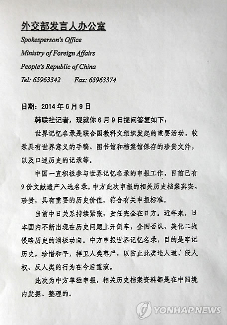 중국 당국이 위안부 관련 기록물의 세계기록유산 등재를 추진한다는 사실이 알려지기는 지난해 6월이다. 당시 중국 외교부는 이런 사실을 확인하면서 중국이 등재를 신청한 목적이 "역사를 깊이 새기고 평화를 소중히 여기며 인류의 존엄을 수호함으로써 이런 반인도적·인권침해적·반인류적인 행위가 다시는 되풀이되지 않도록 하기 위한 것"이라고 강조한 바 있다.