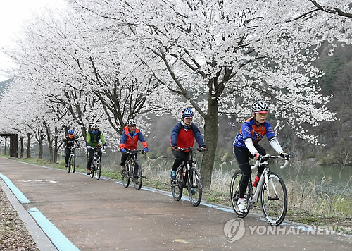 | △ 벚꽃 감상하며 달리는 괴산 오천 자전거길 (괴산=연합뉴스) 변우열 기자 = 충북 괴산군의 오천 자전거길에서 자전거 동호인들이 활짝 핀 벚꽃을 감상하면서 자전거를 타고 있다. 이 자전거길은 괴산군에서 세종시까지 하천을 따라 조성된 것으로 2013년 10월에 개통했다. 2015.4.14 << 괴산군 제공 >> bwy@yna.co.kr |