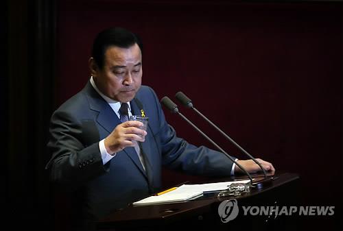 | △ 국회 답변대에 선 이완구 총리 (서울=연합뉴스) 진성철 기자 = 이완구 국무총리가 14일 국회 본회의에서 진행된 대정부질문에서 성완종 전 경남기업 회장과의 금품 수수 의혹에 대한 질의에 답변한 뒤 물을 마시고 있다. |