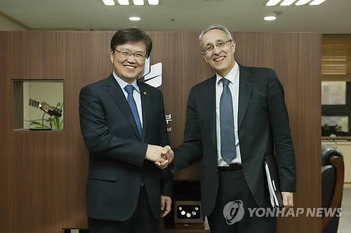 | △ 악수하는 최양희 장관-ITER 국제기구 사무총장 (서울=연합뉴스) 최양희 미래창조과학부 장관(왼쪽)이 14일 오후 경기도 정부과천청사 미래부를 방문한 베르나르 비고(Dr. Bernard Bigot) 국제핵융합실험로(ITER) 국제기구 사무총장과 만나 악수를 나누고 있다. (미래창조과학부 제공) |