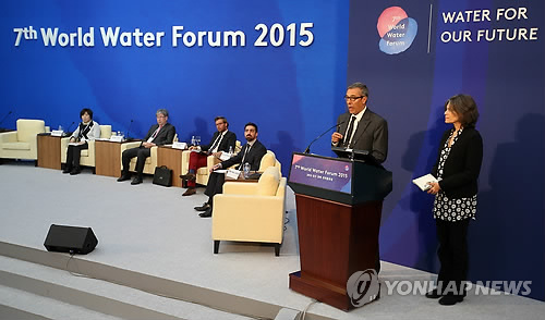 | △ 대구경북 물 행동 전략 발표 (경주=연합뉴스) 한종찬 기자 = 14일 오후 경주 HICO에서 열린 2015 대구·경북 세계물포럼 제 4차 지방정부 회의 폐회 세션에서 바바라 안톤 이클레이 유럽본부 지속가능한 자원·기주변화와 회복력 담당관(오른쪽)과 모하메드 부스라우이 UCLG 세계본부가 '지속가능한 도시를 위한 대구경북 물 행동 전략 발표'를 하고 있다. 2015.4.14 saba@yna.co.kr |