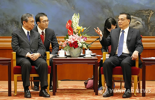 | △ 고노 전 日관방장관, 리커창 中총리 만나 (베이징 AP=연합뉴스) 고노 요헤이(河野洋平) 일본 국제무역촉진협회 회장(전 관방장관, 왼쪽)이 14일(현지시간) 인민대회당에서 리커창(李克强) 중국 총리를 만나 이야기를 나누고 있다. |