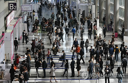 | △ 서울 코엑스에서 열린 한 채용박람회장에서 구직자들이 입장하기 위해 줄 서 기다리고 있다. (연합뉴스 자료사진) |
