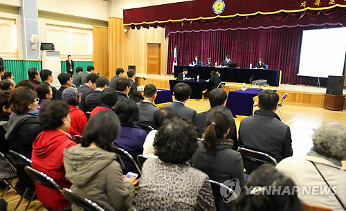 | △ 초등학교 강당서 열린 법정 (용인=연합뉴스) 최종호 기자 = 15일 오후 경기도 용인시 기흥구 지곡동 지곡초등학교 강당에서 주민 등 638명이 콘크리트 혼화제 생산업체 ㈜실크로드시엔티를 상대로 낸 해당 콘크리트 연구소의 공사금지가처분 신청에 대한 2차 심문기일이 '찾아가는 법정'으로 열리고 있다. 2015.4.15 zorba@yna.co.kr |