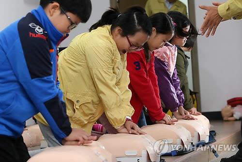 | △ 어린이들이 안전체험교육을 통해 심폐소생술을 배우고 있다.<연합뉴스DB> |