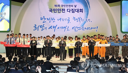 | △ 국민안전 다짐대회 (서울=연합뉴스) 임헌정 기자 = 16일 서울 삼성동 코엑스에서 열린 제1회 국민안전의 날 기념 국민안전 다짐대회에서 참석자들이 안전관리헌장을 낭독하고 있다. |
