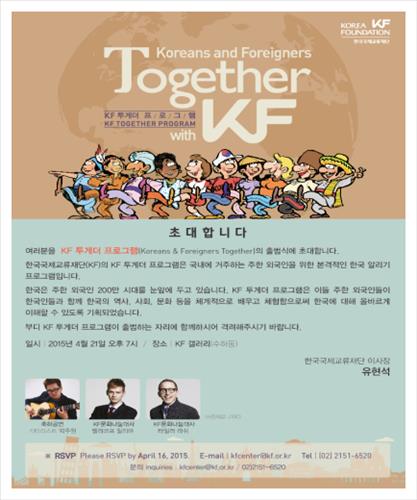 KF 투게더 프로그램으로는 주한 외국인을 대상으로 한국 사회·역사 강좌, 사물놀이·태권도 등 전통문화 강습, 외교·통일 등 현안 브리핑 등이 열린다.