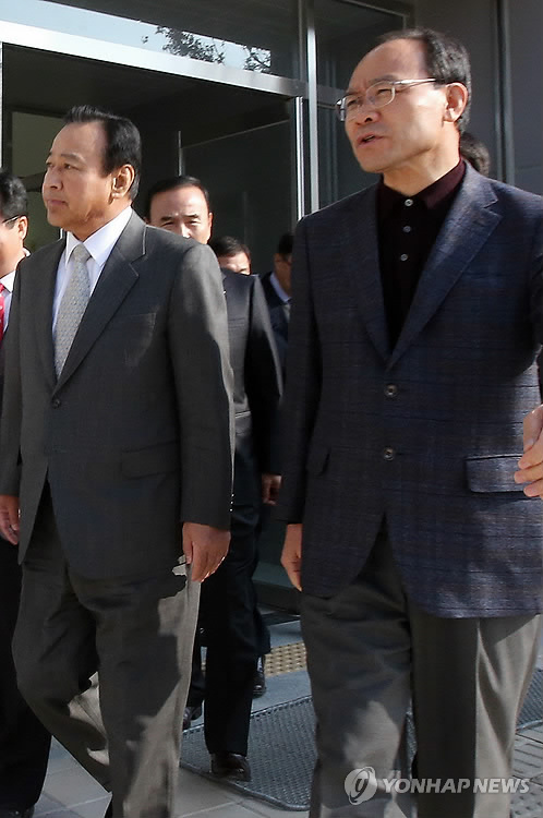 | △ 2013년 12월 3일 이완구 총리가 새누리당 세종시 지원 특위 위원장이었던 시절 성완종 당시 의원과 정부세종청사를 방문해 입주를 앞둔 2단계 공사현장을 둘러보고 있는 모습 (연합뉴스 자료사진) |