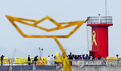 | △ 세월호 참사 1주년 팽목항 추모객 (진도=연합뉴스) 박철홍 = 세월호 참사 1주년인 16일 전남 진도군 팽목항에 추모객들의 발길이 이어지고 있다. |