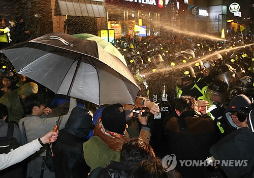 이어 수표교를 통해 종로로 진입한 이들은 오후 10시20분께 종로2가 사거리를 점거하고 광화문 방면으로 이동하다 YMCA 앞에서 차벽과 병력 등으로 막아선 경찰과 맞서 몸싸움을 벌였다.