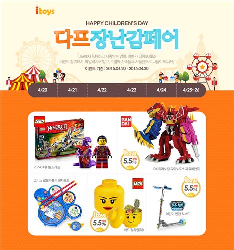 (서울=연합뉴스) 고유선 기자 = 인터파크(www.interpark.com)는 이달 20∼30일 가격배틀쇼핑 '다이나믹프라이스'를 통해 '어린이날 다프 장난감페어'를 진행한다.