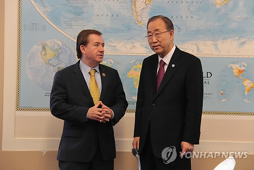 반 총장은 이날 오전 워싱턴DC 의회 레이번 빌딩에서 열린 에드 로이스(공화·캘리포니아) 미 하원 외교위원장과의 회동 직후 연합뉴스 기자와 단독으로 만나 "언론보도를 봐서 관련 내용을 알고 있다"면서 이같이 밝혔다.