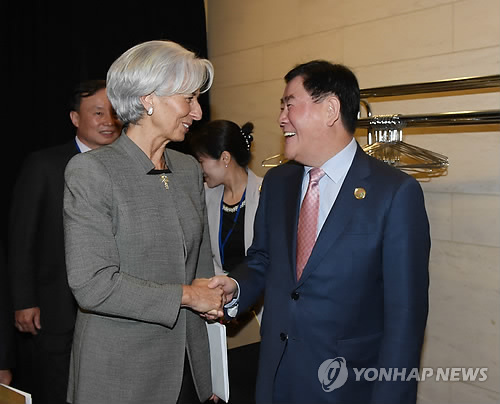 | △ 최경환 부총리, 크리스틴 라가르드 IMF총재 양자회담 (서울=연합뉴스) 주요 20개국(G20) 재무장관·중앙은행총재 회의 참석 차 미국 워싱턴 D.C를 방문 중인 최경환 경제부총리 겸 기획재정부 장관이 16일 IMF(국제통화기금)에서 크리스틴 라가르드 IMF총재와 양자회담에 앞서 악수하고 있다. (기획재정부 제공) |