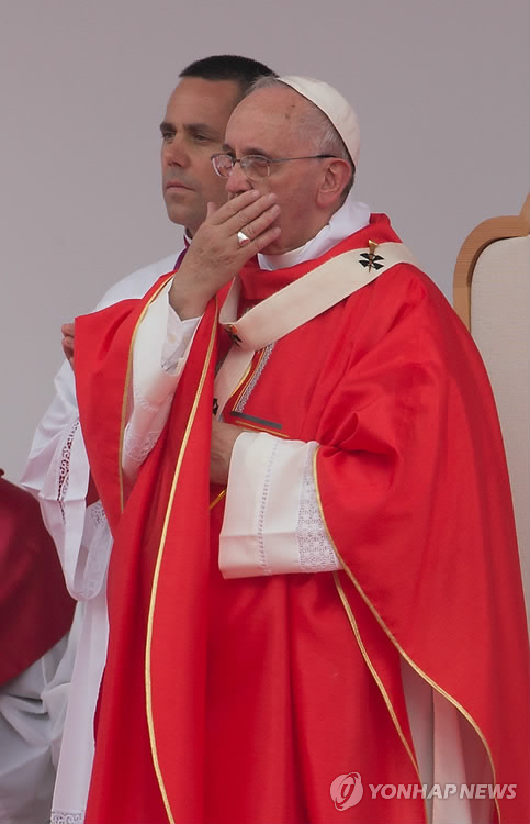 | △ <교황방한> 교황집전 시복미사 (서울 사진공동취재단=연합뉴스) 16일 광화문 광장에서 프란치스코 교황이 시복식 미사를 집전하고 있다. 2014.8.16 photo@yna.co.kr |