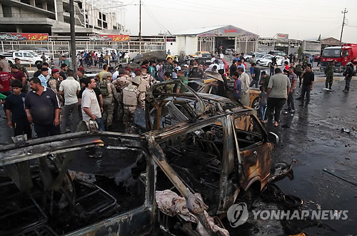 | △ 폭탄테러 현장은 처참 (바그다드 AP=연합뉴스) 이라크 수도 바그다드의 시장 등 공공장소에서 17일(현지시간) 연쇄 폭탄 테러가 발생해 최소 40명이 사망했다. 특히 시아파교도들이 많이 사는 동부 하비브야 지역 중고차업체에서 차량 폭탄이 터져 15명이 사망하고 26명이 다쳤다. 보안군과 시민들이 폭발 현장에 모여 있다. |