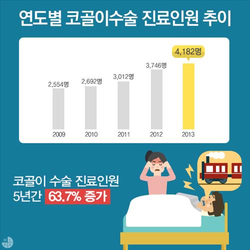 18일 건강보험심사평가원의 웹진 건강나래 최근호(4월호)에 따르면 코골이수술을 받는 진료인원은 2009년 2천554명에서 2013년 4천182명으로 1천600여명 늘었다.