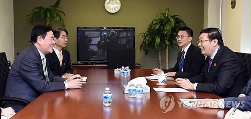 (워싱턴=연합뉴스) 박초롱 기자 = 최경환 경제부총리 겸 기획재정부 장관이 17일(현지시간) 러우 지웨이 중국 재무장관을 만나 아시아인프라개발은행(AIIB) 설립을 위한 협상에서 한국의 이해를 최대한 반영해 달라고 요청했다.