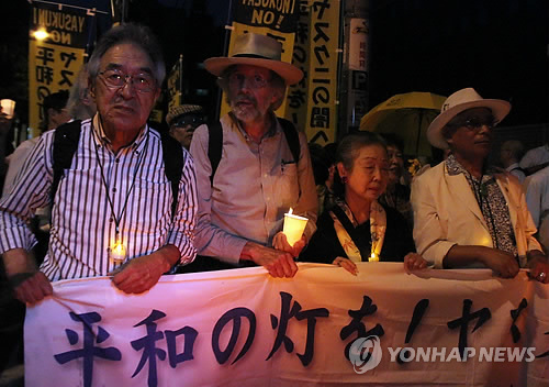| △ 야스쿠니신사 참배반대 촛불시위 (도쿄=연합뉴스) 이세원 특파원 = 야스쿠니반대공동행동 한국위원회, 민족문제연구소 등 한국 단체와 야스쿠니 신사 참배에 반대하는 일본 시민단체 회원 등이 9일 오후 일본 도쿄도(東京都) 지요다(千代田)구 야스쿠니(靖國)신사 인근에서 참배에 반대하는 촛불 시위를 하고 있다. 2014.8.9 <<국제뉴스부 기사 참고>> sewonlee@yna.co.kr |