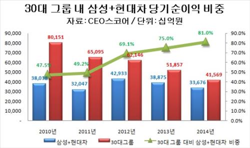 이 때문에 삼성·현대차그룹의 당기순이익이 30대 그룹 전체에서 차지하는 비중이 2010년 48%에서 지난해엔 81%로 갑절 수준까지 상승한 것이다.