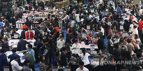 | △ 19일 오후 서울 강남구 대치동 세텍에서 열린 '롯데백화점 블랙쇼핑데이'를 찾은 많은 고객들이 다양한 제품을 살펴보고 있다. |